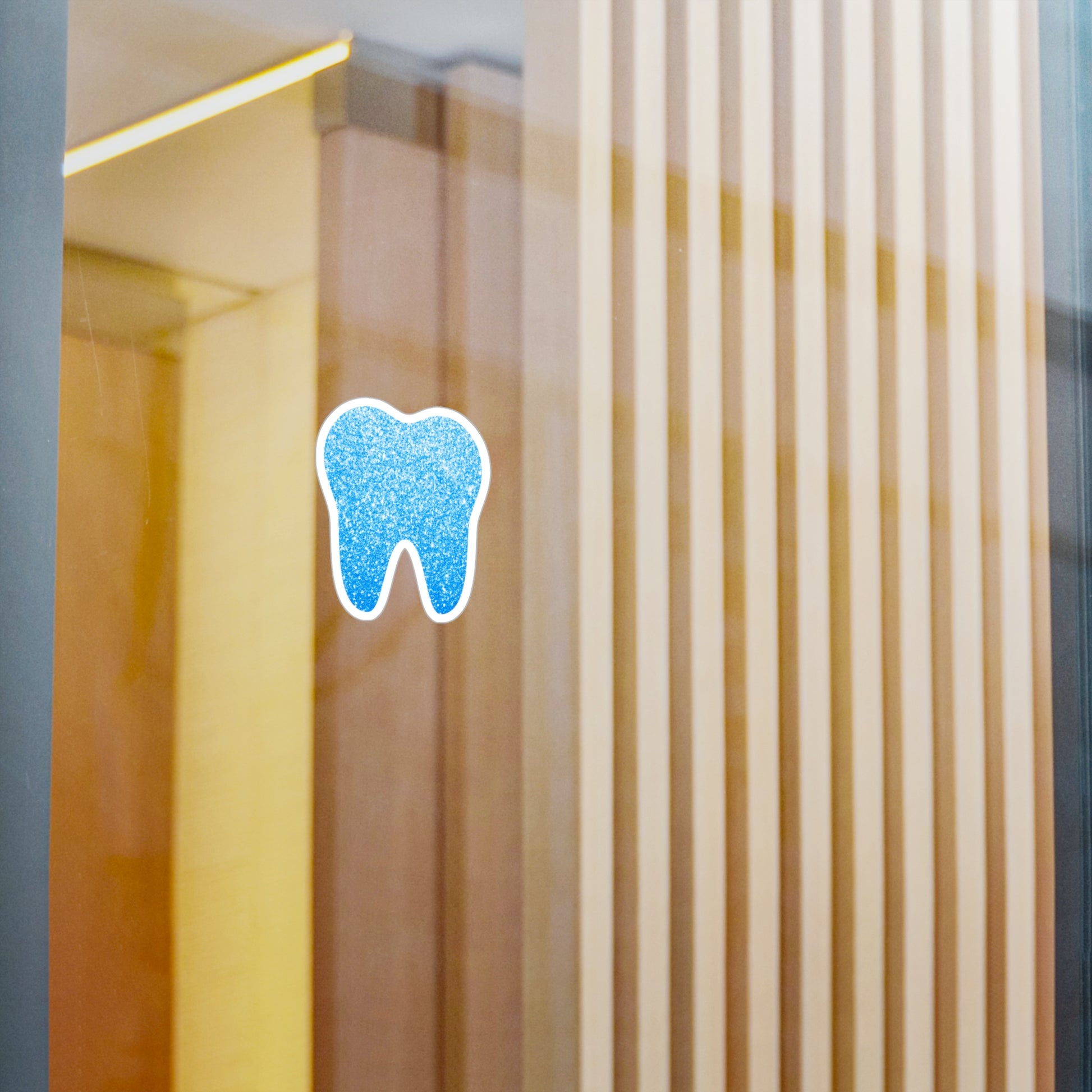 A glossy tooth-shaped vinyl decal that brings a cheerful, professional touch to dental spaces and personal gear. The satin-finish sticker shows a vibrant blue sparkle texture with a subtle 1/8" white kiss-cut border, so it stands out on windows, laptops, water bottles, planners, or appointment boards. Durable and water-resistant, it keeps its color outdoors and wipes clean without leaving residue, making it a low-fuss way to add personality to a practice, dental student kit, or patient gift bag. The small barcode on the backing and slight grain in very light colors are normal results of the production process.