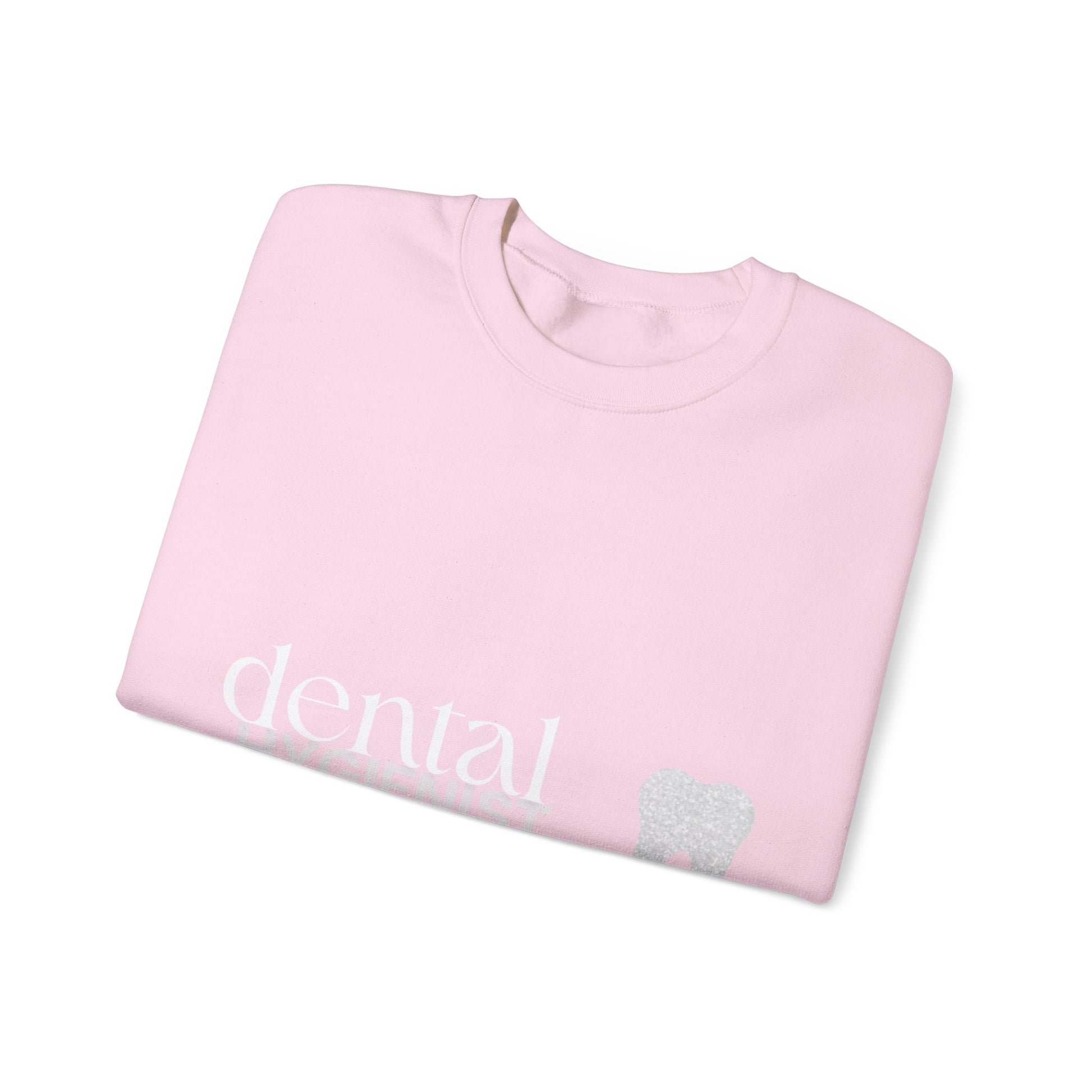 A soft, mid-weight crewneck sweatshirt designed with understated dental-care charm. Clean white fabric carries a subtle, tone-on-tone embroidered tooth icon and the faint text “HYGIENIST” across the chest, so the piece reads as minimal and professional while still feeling warm and lived-in. The relaxed classic fit, ribbed collar and cuffs, and double-needle stitching make it dependable for long clinic days, weekend errands, or quiet study sessions. It’s breathable yet cozy — the kind of layer you pull on between appointments or while prepping notes, and that quietly signals your role without shouting. The neutral palette and simple embroidery let you pair it with scrubs, jeans, or leggings; it wears like a low-key uniform and a personal statement at once.