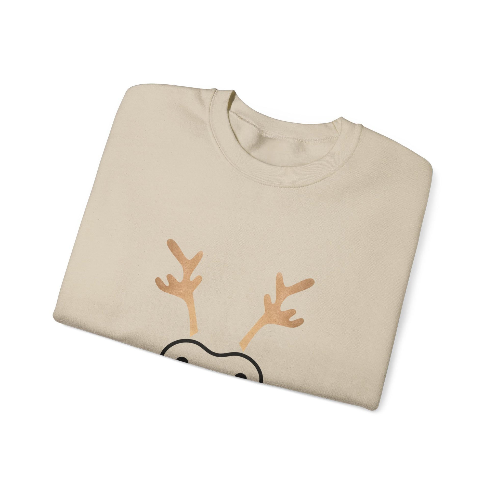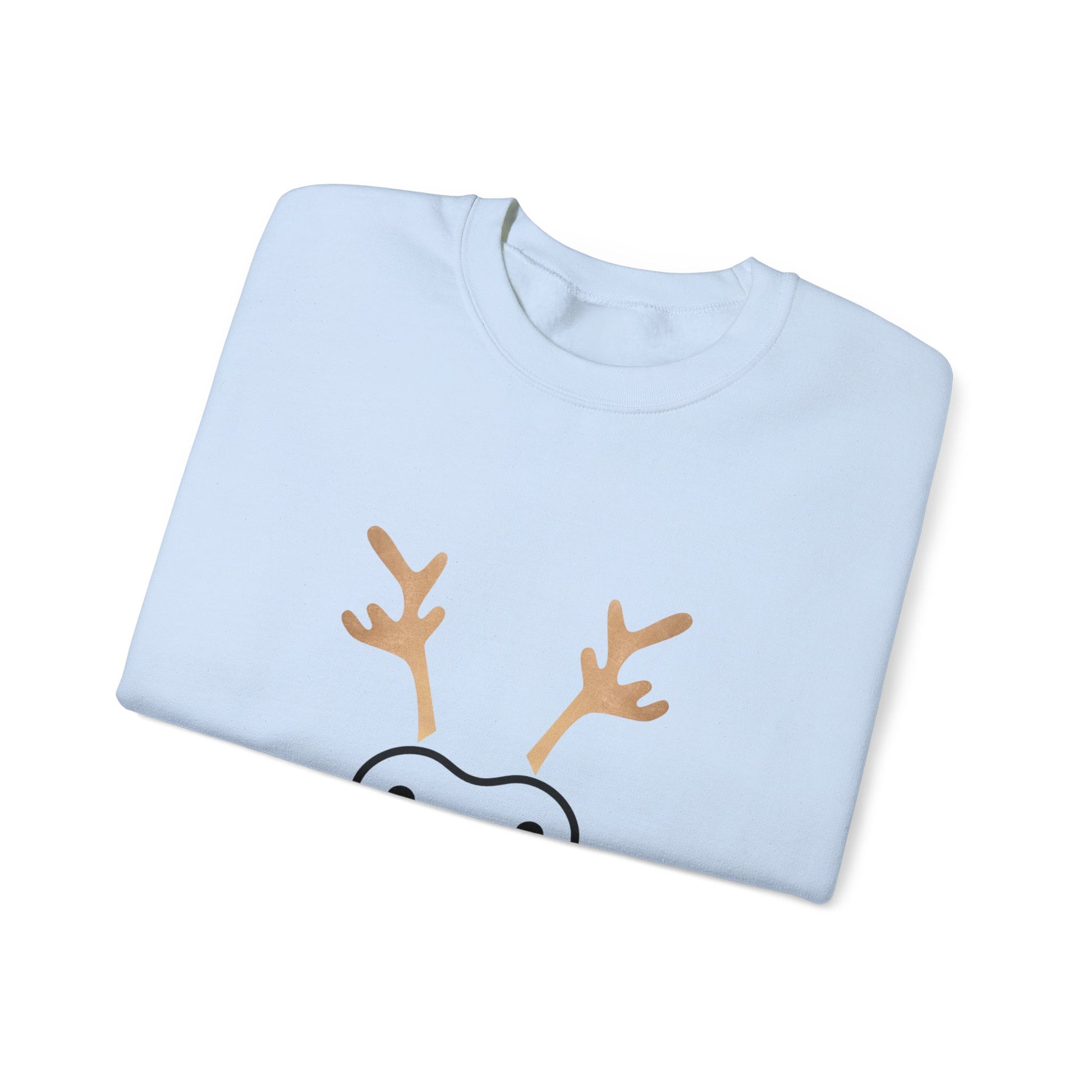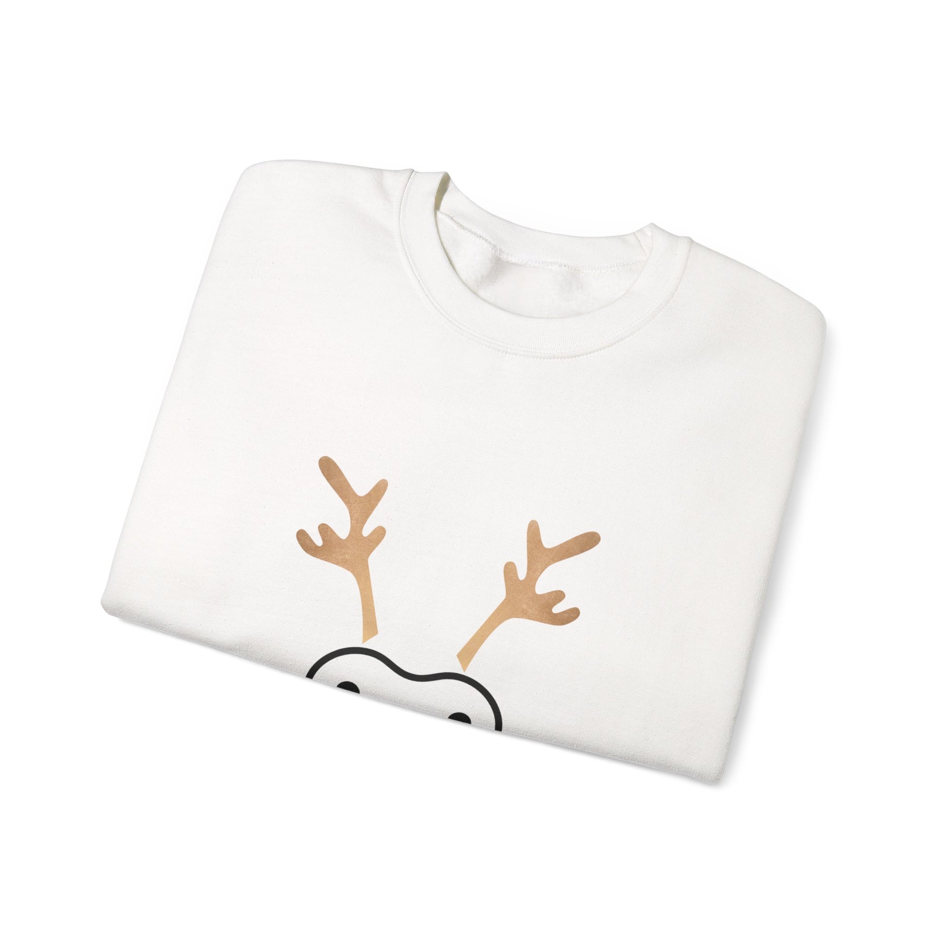 Soft, cozy, and quietly joyful — this crewneck brings a playful holiday tickle to your everyday rotation. The front shows a minimalist reindeer face rendered with a tiny red nose and delicate antlers, letting the white sweatshirt act like fresh snow around the design. Lightweight enough for layering, yet substantial in feel, the sweatshirt settles in like a warm mug by the window on crisp December mornings. Wear it to low-key gatherings, tree-trimming nights, or while wrapping presents; it reads as gentle holiday spirit rather than loud seasonal cheer. Thoughtful details — like ribbed collar and cuffs, durable double-needle stitching, and a tear-away label — keep comfort front and center so the design can do the smiling for you.